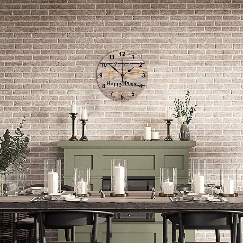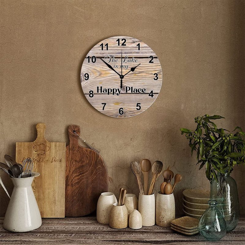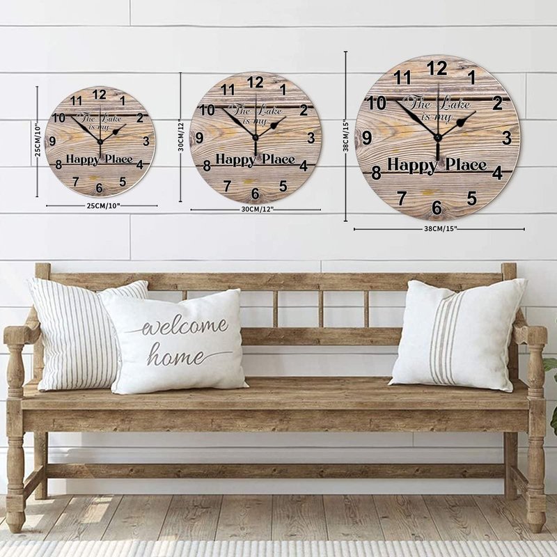Funny Wood Wall Clock Lake is Happy Place Easy to Use Rustic Round Wooden Clock Easy to Read Stylish Wall Wood Clock Countryside Wall Hanging Art for Lake House Dining Room Study Decor