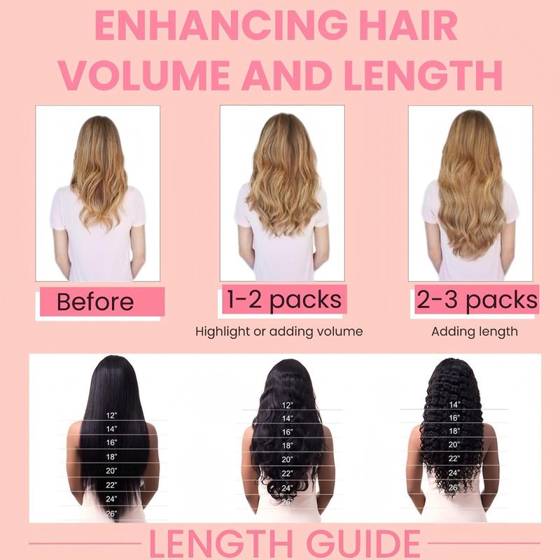 - Effortless Install Clip in Hair Extension: Instantly enhance volume and making your hair look fuller and healthier. It's suggested 1-2 packs for adding highlight or enhancing volume. 2-3 packs are better for adding length. Also, our clip in hair extensions are suitable for straightening, curling, dying (only from light to dark colors), and styling with different tools.