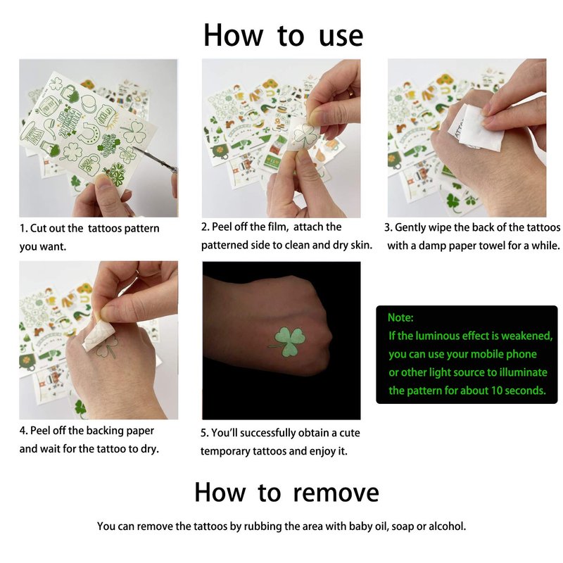 - EASY TO APPLY AND REMOVE: Our temporary shamrock tattoos are super easy to apply and stayed on really well. You can remove them by rubbing the area with baby oil or alcohol. There are detailed instructions on the back of each sheet of st. patrick's day tattoo sticker, which teach you how to paste and clean, make it more convenient for you to use our St. Patrick's tattoos.