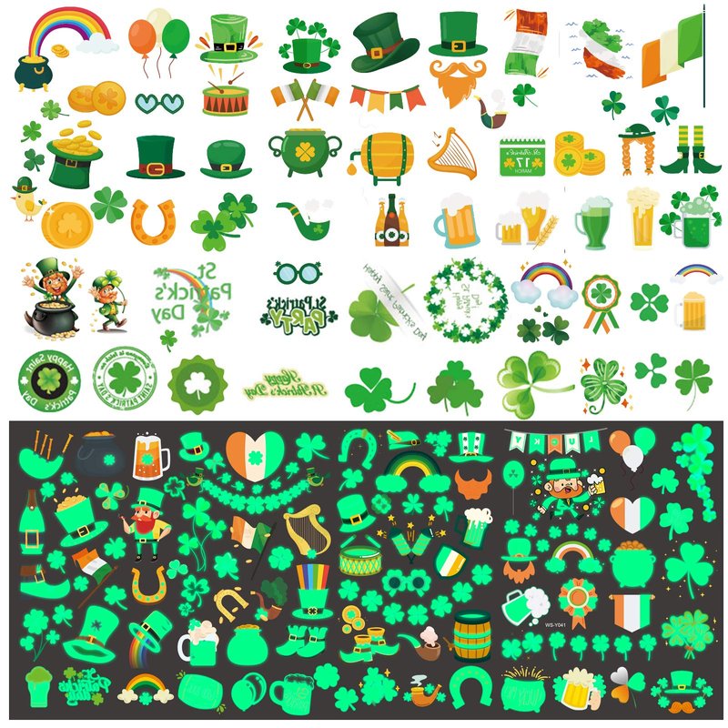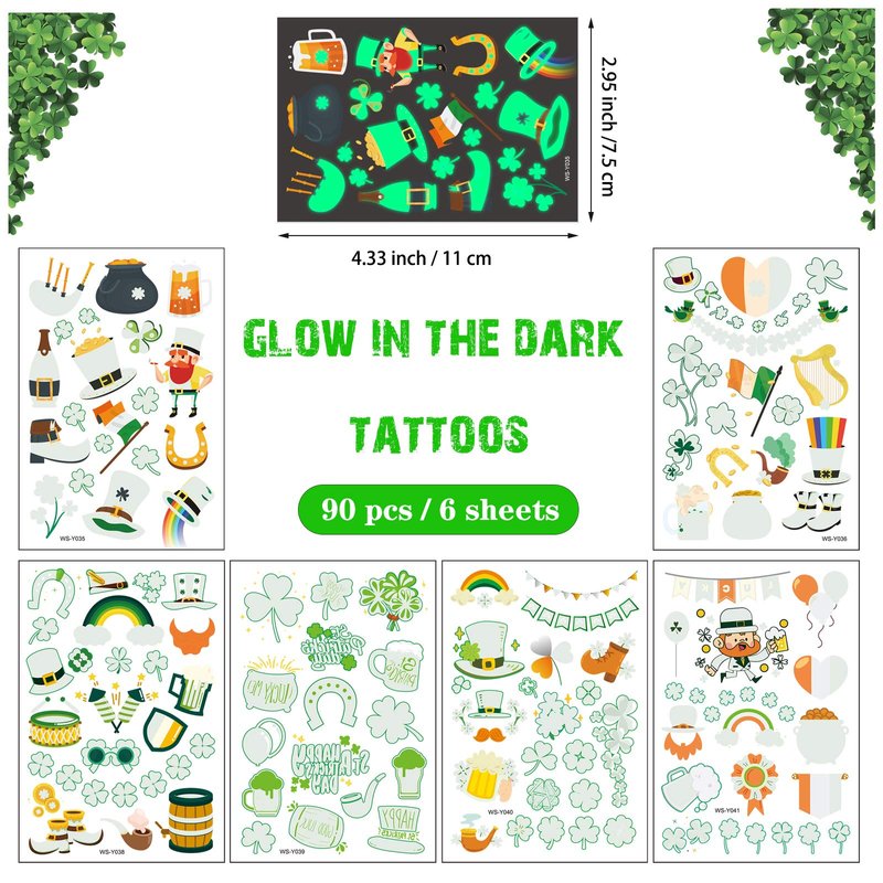 - A HUGE ASSORTMENT OF ST. PATRICK'S DAY TATTOOS: 200 pcs st patricks tattoos, including 110 regular and 90 glow in the dark, contain various unique and creative patterns, such as shamrock, lucky clover, horseshoes, Irish flags, pot of gold, rainbow, leprechaun, fun sayings, lucky hat, beer mug and lots of selection! The perfect addition to your holiday supplies and saint patricks day accessories.