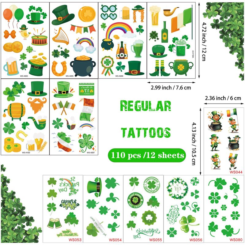 200 x St. Patrick's day tattoos (regular tattoos: 110 pcs/12 sheets, glow in the dark tattoos: 90 pcs/6 sheets)