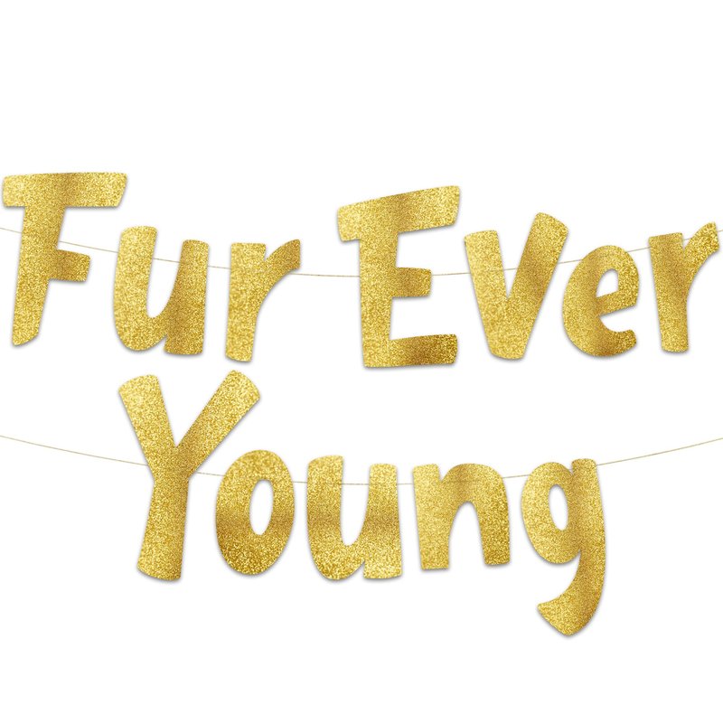 Furever Young Gold Glitter Banner – Dog Birthday Banner – Cat Birthday Decorations – Funny Puppy and Kitten Birthday Party Supplies and Gifts