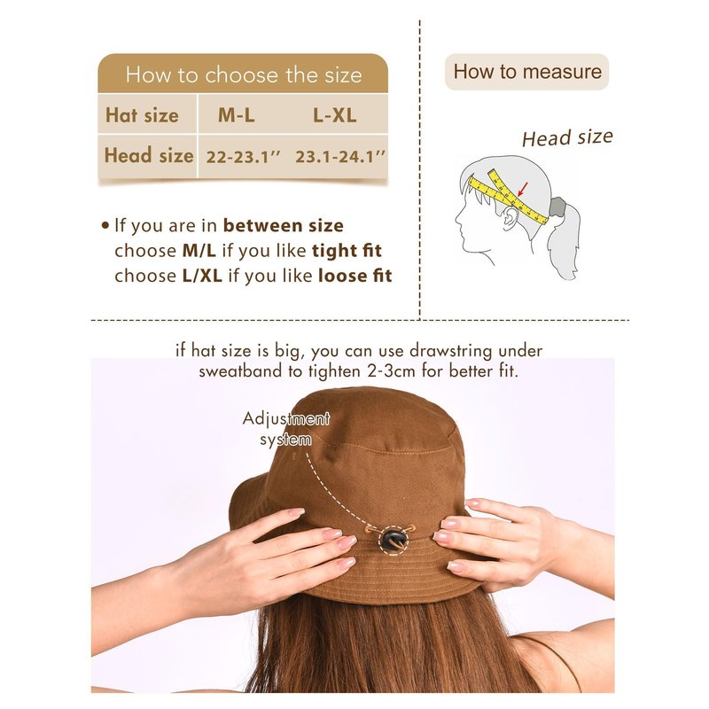 - Cotton beach bucket hat have two sizes of head circumference,adjustable with Velcro.(Size M-L: 22-23.1" ,Size L-XL: 23.1-24.1")