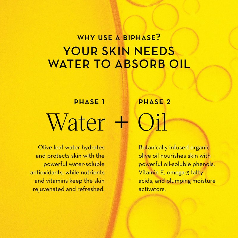 - Innovative Biphase Formula: Uniquely combines botanically infused Sicilian olive oil with nutrient-rich olive leaf water for powerful hydration, leaving skin visibly plumped and glowing.