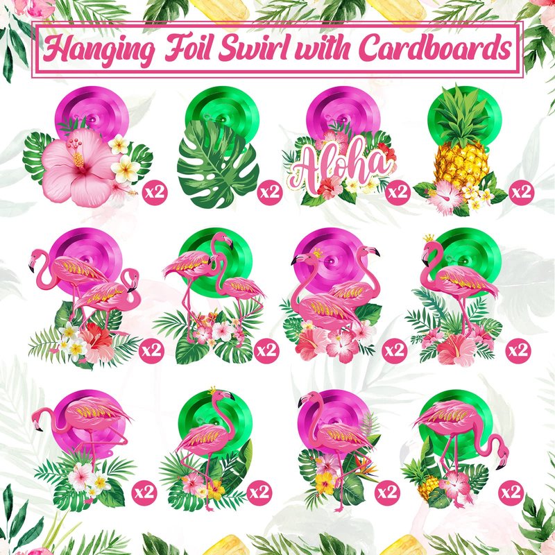 - Hawaiian Themed Design: our beach party ceiling hanging swirls adopt 12 different summer Hawaiian elements, such as lifelike flamingos in various forms, palm leaf, pineapple, flower and the word of "Aloha", fancy and interesting design and vibrant colors will create a nice tropical Hawaiian atmosphere
