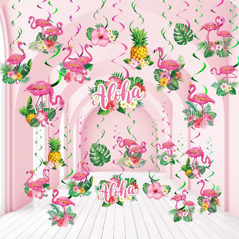 - What You Get: Hawaiian party ceiling streamers set includes 24 pieces flamingo paper cutouts in 12 different design patterns, 24 pieces single tailed spirals (pink x 12, green x 12), 6 pieces double tailed spirals (pink x 3, green x 3), each spiral can extend to approximately 32 - 40 inches long, bright and exquisite, you can hang it around the house to enhance your summer party vibe