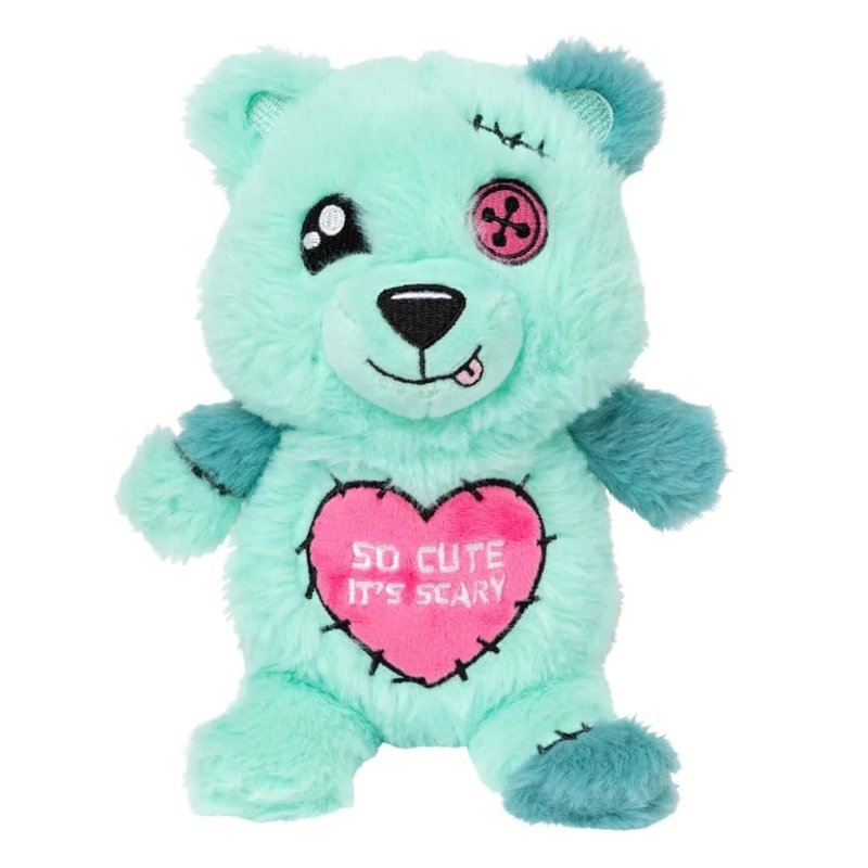 Furry plush "Deaddy Bear - So Cute It's Scary" dog toy with squeaker. This cute, super soft patchwork & Halloween-themed toy is sure to be a favorite of your pup's! Measures approximately 9" tall. This nicely made toy has embroidered for safety features... a play toy, buddy for your dog. Machine washable, color-safe.