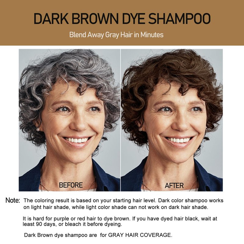 - 【Gray Hair Coverage】Dark Brown hair dye shampoo for women and men, blends away every last strand of your grays in minutes. Say goodbye to your grays and maintain youthful look with this Semi-Permanent brown hair color shampoo.