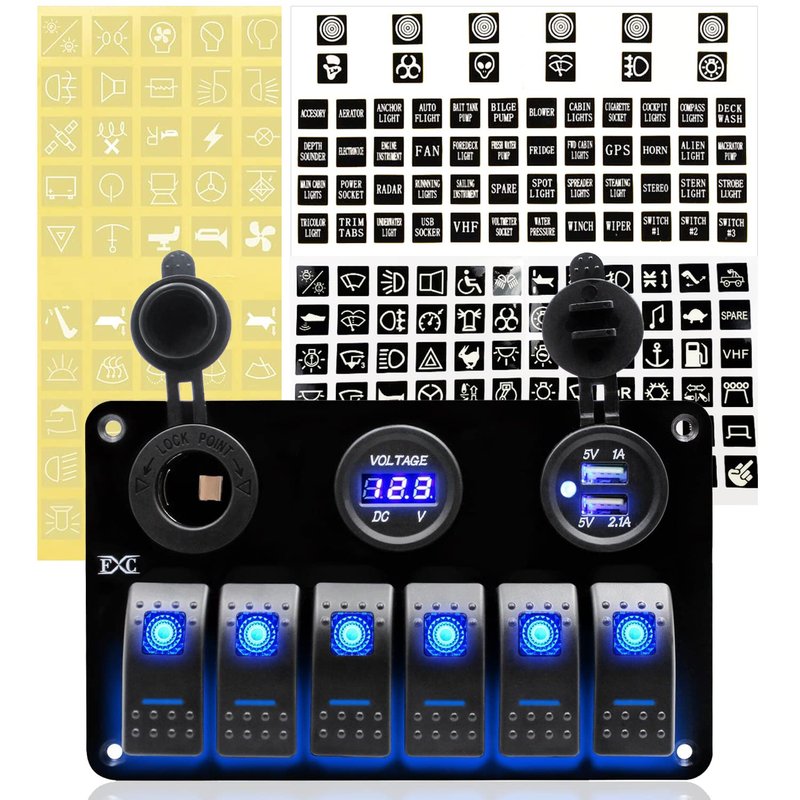 - 【FXC 6 Gang Switch Panel】Blue LED 6 gang switch panel with 12V cigarette socket, voltmer and dual usb charger outlet, great for all types of circuit control, charging needs. can be DIY used to control any vehicle electrical appliance. Universally fit for 12V-24V vehicles, widely applicable for trucks, jeeps, trailers, RVs, caravans, bus, marine boats, yachts,etc.
