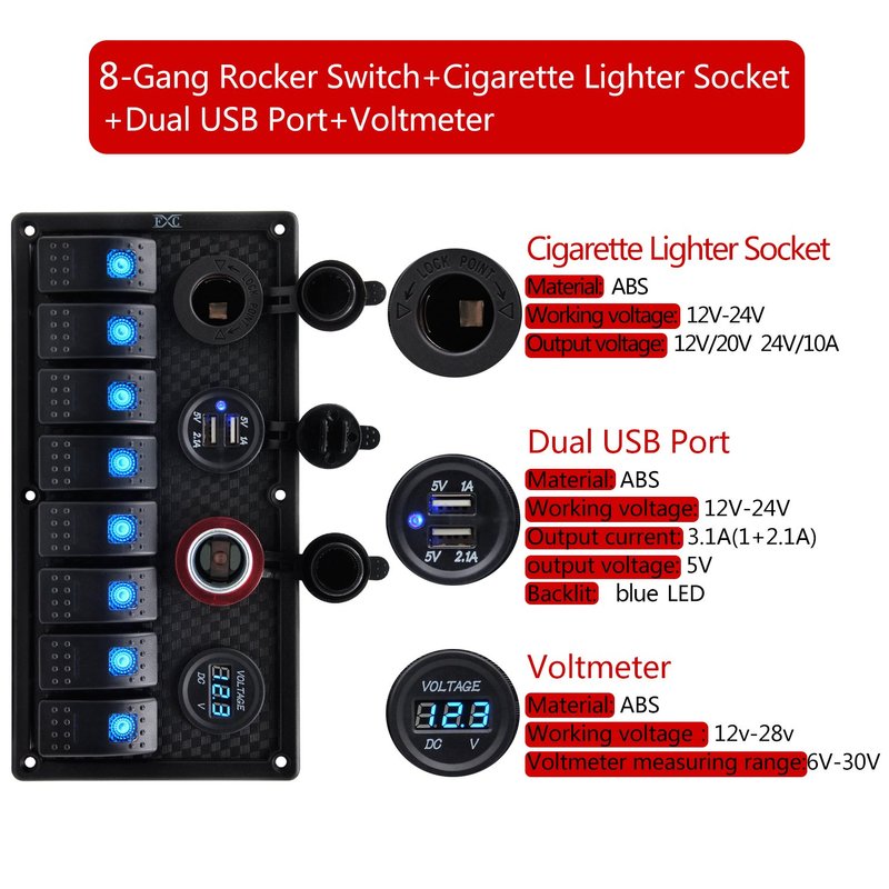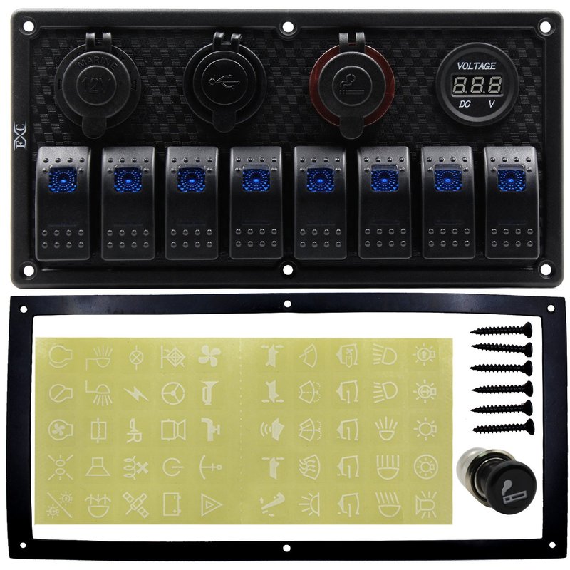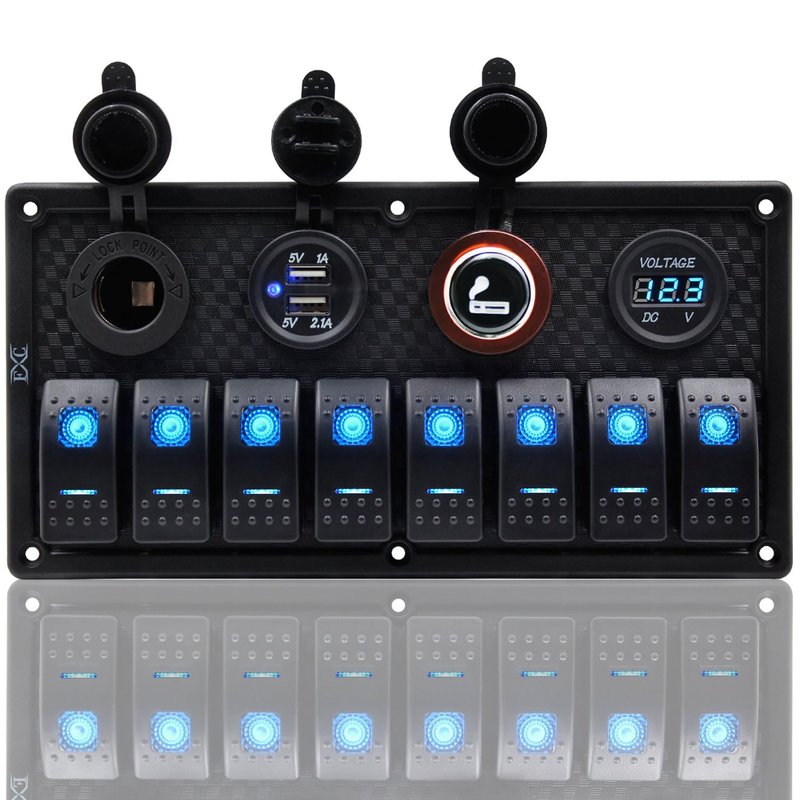 FXC 12V 24V Blue LED ON/Off Marine Multi Function Switch Panel Waterproof 8 Gang Rocker Switch Panel for Boat Car Truck Rv Toggle Switches Panel with Circuit Breaker Dual USB Charger Voltmeter