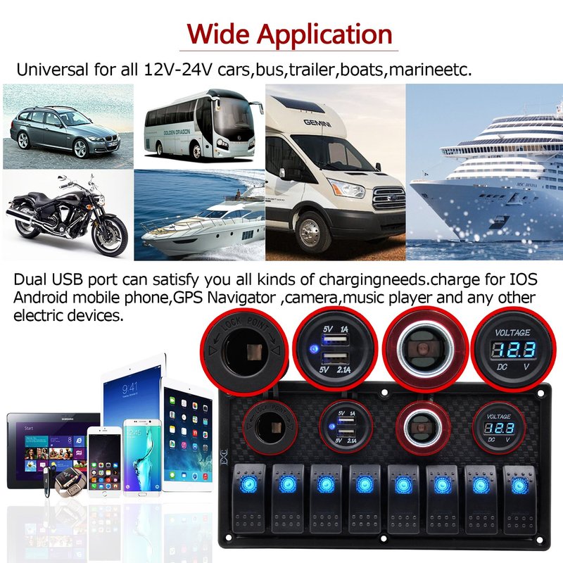 - 8 gang rocker switch with blue LED Light , Loop Circuit: ON-OFF 12V-24V .size for panel:225*120*90 mm.