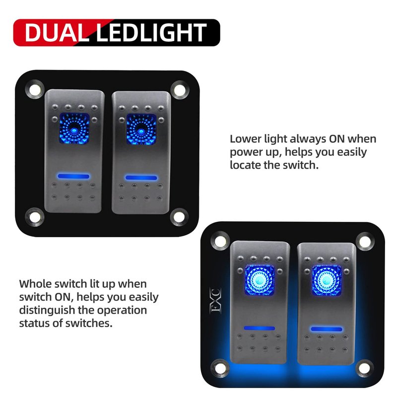 FXC Rocker Switch Aluminum Panel 2 Gang Toggle Switches Dash 5 Pin ON/Off 2 LED Backlit for Boat Car Marine Blue