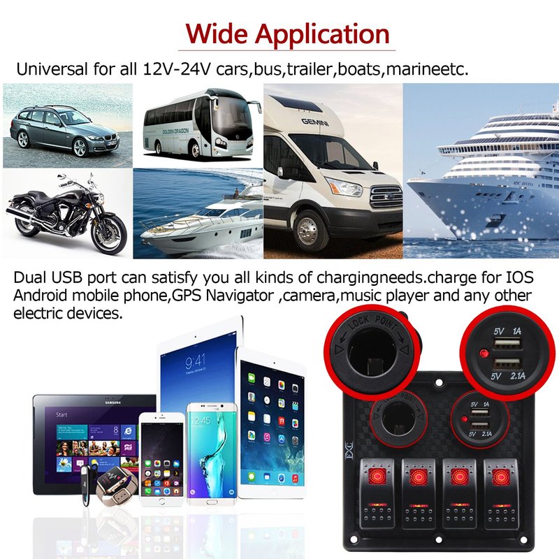 Specification: Heavy duty ABS plastic face panel Size for panel:130*120*90mm(51.18"x47.24"x35.43") Rocker Switch: Loop Circuit:ON-OFF Rating:DC 12V 20A,24V 10A Electric Strength:AC 1500V 1minute Operating Temperature:-25degree to 80degree Electrical Life:10000 make and break cycles at full load Dual USB Port: Material:PA66 Working voltage:12-24V Output current:3.1A Output voltage:5V LED Light:Blue Cigarette Lighter Socket: Material:PA66 Working voltage:12-24V Output voltage:12-24V LED Light:Red Package included: 1 x Switch Panel 2 x Pre-printed labels 4 x Stainless Steel Screw