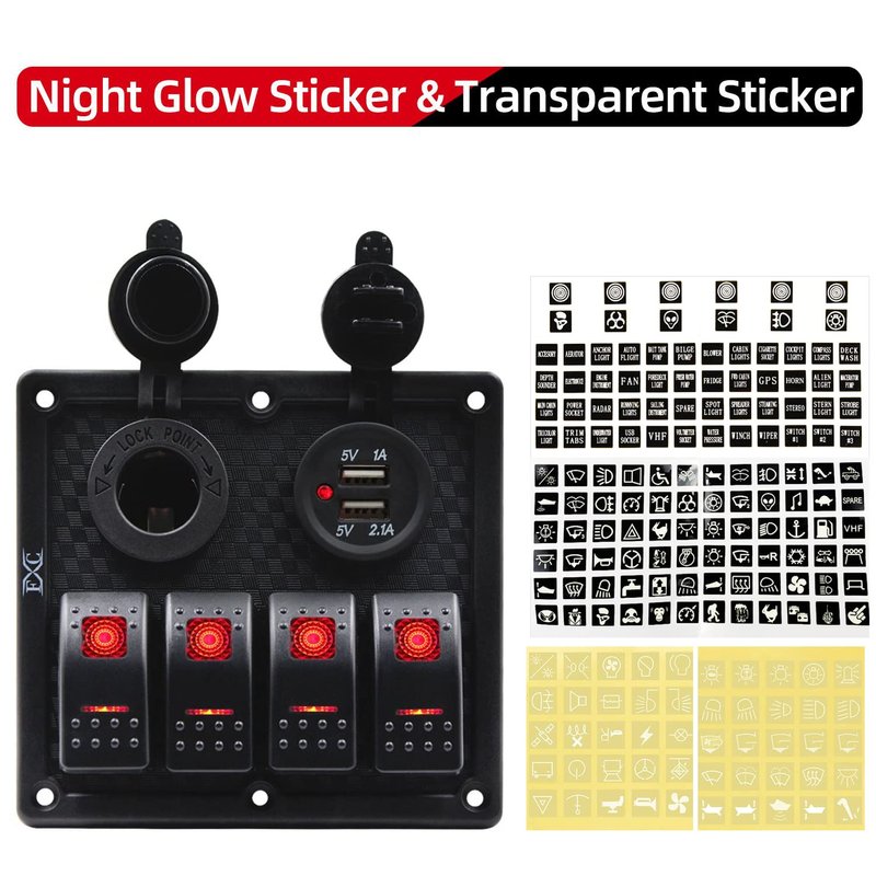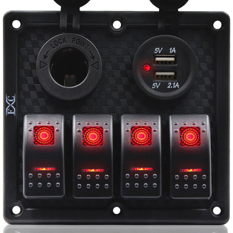 FXC Waterproof Marine Boat Rocker Switch Panel 4 Gang with Dual USB Slot Socket + Cigarette Lighter Red LED Light for Car Rv Vehicles Truck