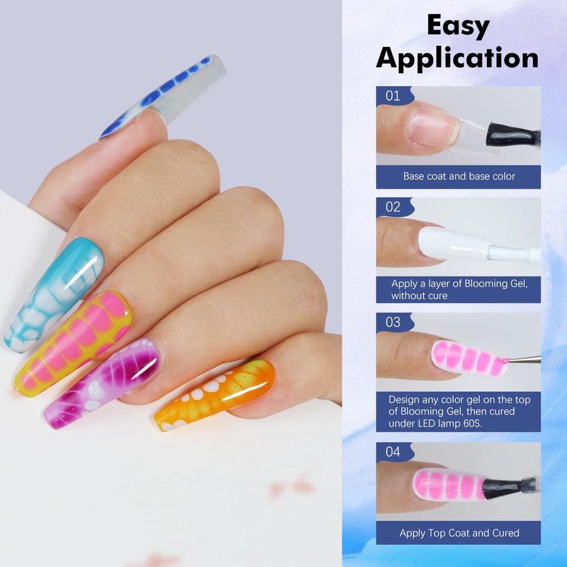 - Easy Application:How to use Blooming Gel? Before color gel, apply a layer of Blooming Gel onto the nails, without cure,keep blooming gel wet,design any color gel on the top of Blooming Gel, wait a few seconds to let the color bloom, then cured under LED/UV lamp 60S.