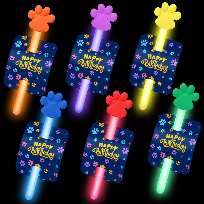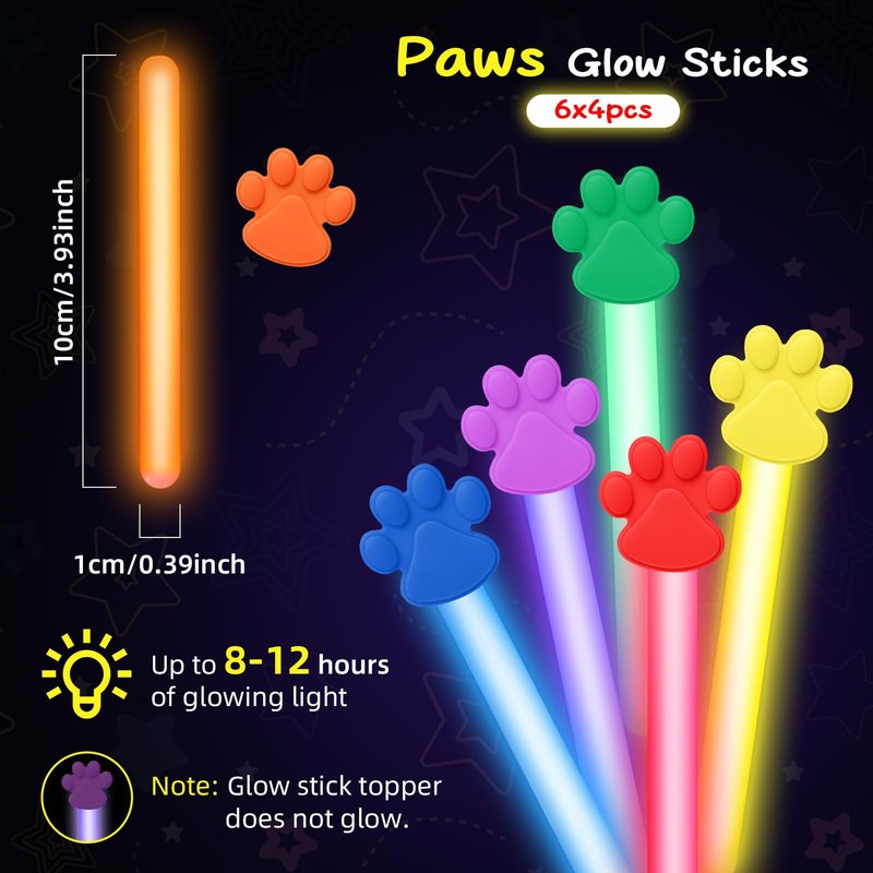 - Brighten Up Any Celebration: Our Paw Glow Sticks are the perfect addition to your paw party supplies, featuring 24 vibrant glow sticks in 6 adorable paw print designs. Each stick measures 4 inches, ensuring they light up any event with fun and flair.