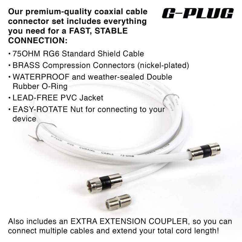 - OUR CUSTOMER PROMISE: At G-PLUG, we’re committed to our customers’ ABSOLUTE SATISFACTION. If for any reason you aren’t thrilled with your internet and TV aerial extension cable within 30 DAYS of purchase, simply contact us directly to send back your undamaged coaxial cable compression connector set, and we will return your F connector to coax cable PAYMENT IN FULL. We also offer a 12-MONTH warranty on our compression coaxial connector and cable for a free REPLACEMENT or full reimbursement.
