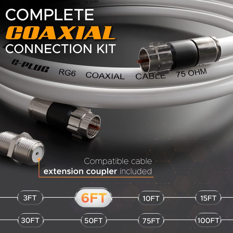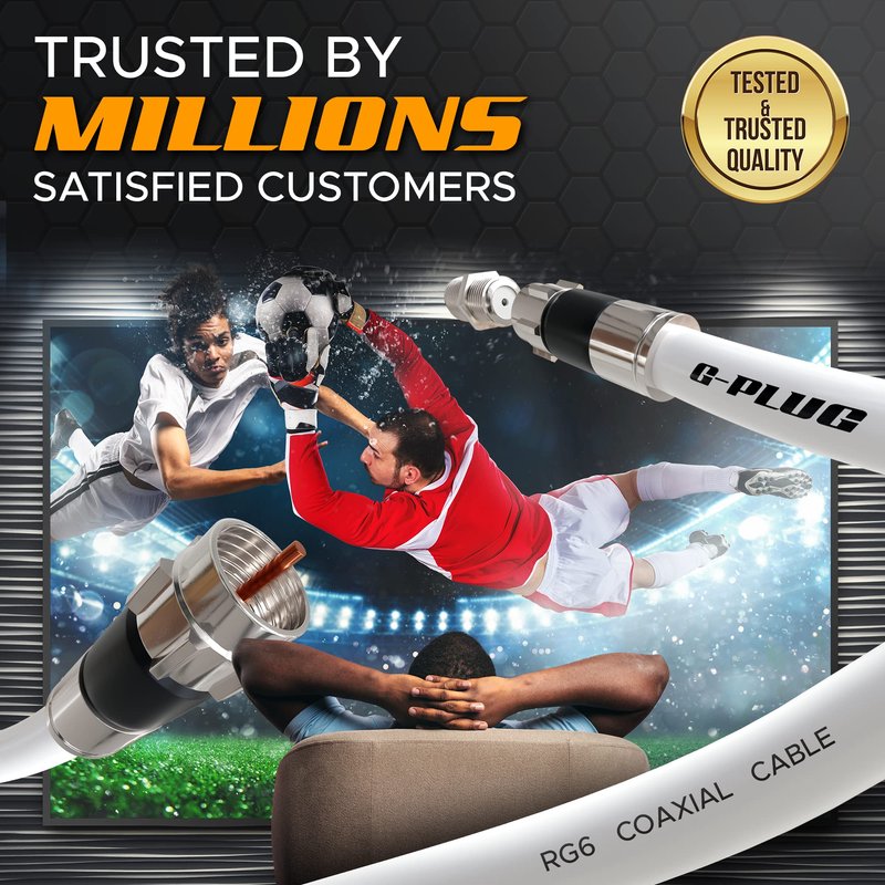 - UNLIKE OTHER COAX CONNECTORS THAT give you a SPOTTY SIGNAL and an INCONSISTENT connection, the G-PLUG 75ohm Standard Shield RG6 Cable provides a solid, RELIABLE CONNECTION and effectively extends your signal, due in part to its nickel-plated brass COMPRESSION connectors – known as the best type of F connectors to shield signals from noise. Our F type connector is compatible with all RG6-wired devices: BROADBAND & high-speed Internet, SATELLITE TV, digital TV, and more.