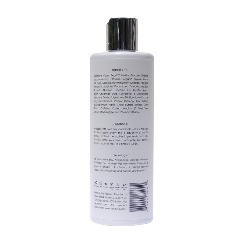 G4U Caffeine Shampoo is a complete hair solution to help reduce hair loss, stimulate hair regrowth and support good hair health for both men and women. Unique combination of natural and quality ingredients such as caffeine, biotin, keratin, niacin, argan oil, coconut oil, shea butter, saw palmetto, ginseng and piroctone olamine nourishes, stimulates and revives the scalp to reduce hair loss and grow hair naturally. A hair shampoo designed to clean, strengthen and stimulate hair regrowth while providing a solution for hair loss, hair fall, thinning, split ends, scalp detox, dryness, dandruff and frizz with regular use. Shampoo for hair thinning and hair loss. Hair growth shampoo. Hair loss shampoo. Hair thickening shampoo. Sulfate free shampoo. Paraben free shampoo. SLS free shampoo. Natural shampoo. DHT blocker shampoo. Shampoo for men. Shampoo for women. Moisturizing shampoo. Volume shampoo. Shampoo for oily hair. Shampoo for dry damaged hair. Shampoo for fine hair. Shampoo for thin hair. Cruelty free shampoo. Nourishing shampoo. Strengthening shampoo. Salon shampoo. Professional Shampoo. Ingredients: Caffeine: When applied topically, penetrates into the hair roots and stimulates them. It speeds up the hair growth cycle, promotes healthy hair growth and prevents hair loss. It strengthens hair and adds shine. Saw Palmetto: Helps block 5-alpha-reductase, an enzyme that can create DHT. Since DHT is responsible for baldness, saw palmetto might treat hair loss. Argan Oil: Makes hair softer, silkier and shinier. Helps to hydrate and moisturize your hair. May help to treat split ends and tame frizzy hair. Keratin: Helps hair look thick, full and glossy. May also make curly hair less frizzy, easier to style and straighter in appearance. Biotin: Thickens hair, stimulates hair growth, increases volume and adds shine. Piroctone olamine: Promotes a healthy scalp by reducing dandruff and flaking. Helps stimulate hair growth.
