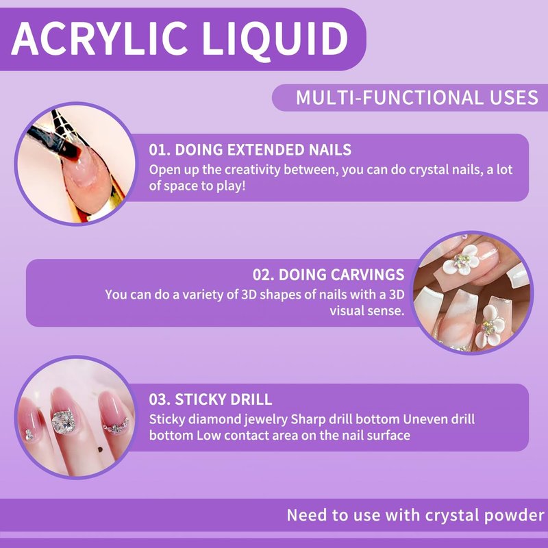 - 【Usage of Acrylic Liquid】: Cleaning your nails with a rubbing strip and applying a base coat,then let it dry with a nail lamp. Put a nail form on your nail. Then,use an acrylic brush(not included) to dip in an appropriate amount of acrylic liquid and acrylic powder (not included). Apply to your nails and wait 1-2 minutes to dry. Take off the nail form,trim your nails.Finally, apply the top coat and let it dry under nail lamp.