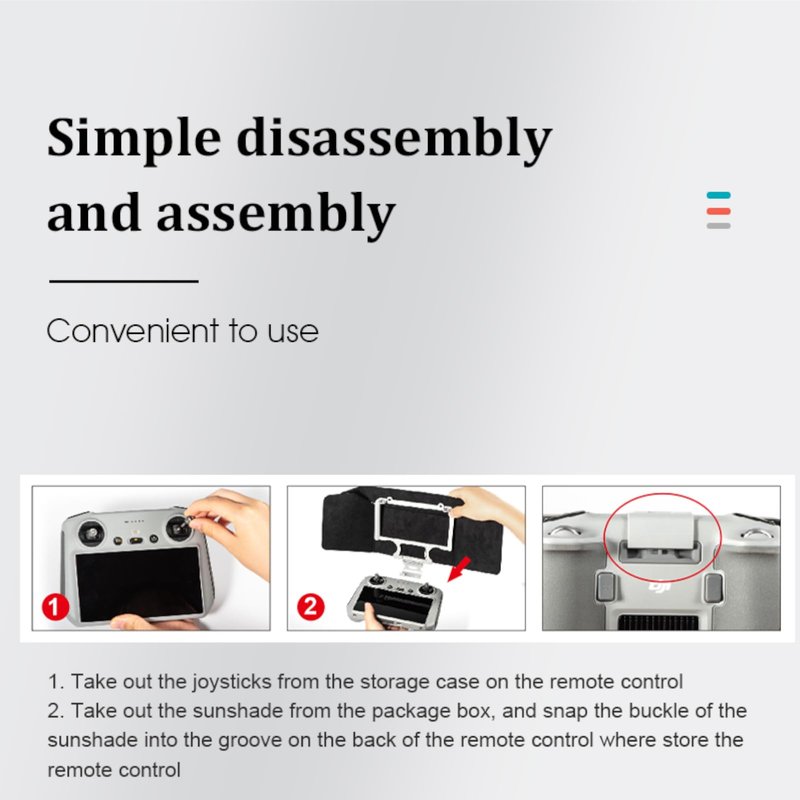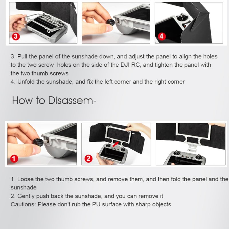 - 【Sunshade】 The Unique Process Effectively Reduces the Interference of Light and Brings Better Flight Vision. Sun Hood is Specially Designed for DJI Mini 3 / Mini 3 Pro RC Controller. This Sunshade Can Be Foldable and Adopts a Velcro Fixation Design for Quick Installation and Storage. The Sunshade is High-end Pu & Soft Glass-fiber, Will Not Scratch Your Remote Control.