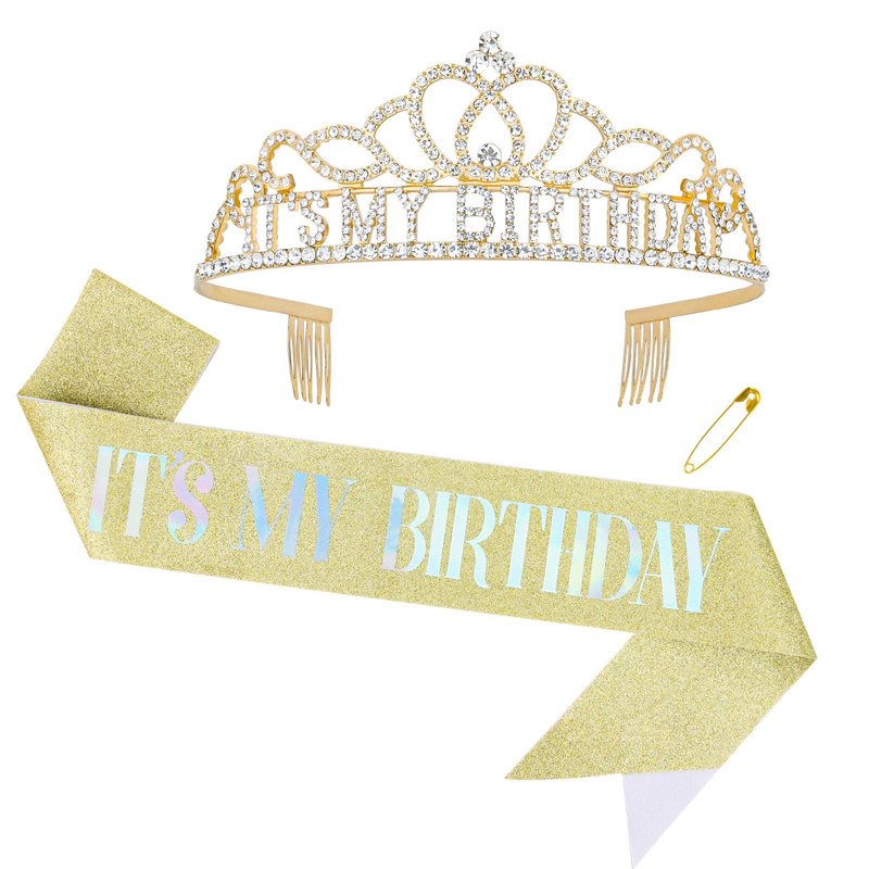 Birthday sash tiara set: IT'S MY BIRTHDAY crown + gold birthday sash decorate with "IT'S MY BIRTHDAY" pattern + hair clips Occasion: Perfect for birthday party supplies, parties, proms, anniversaries, photography, costumes and more! Also a suitable gift for for someone you love or respect.