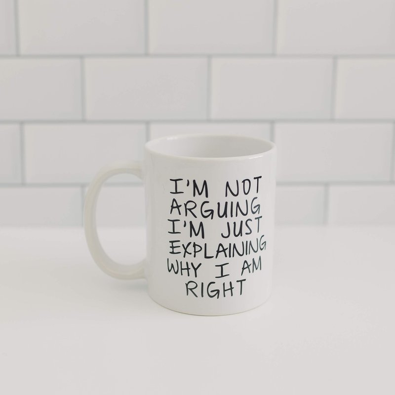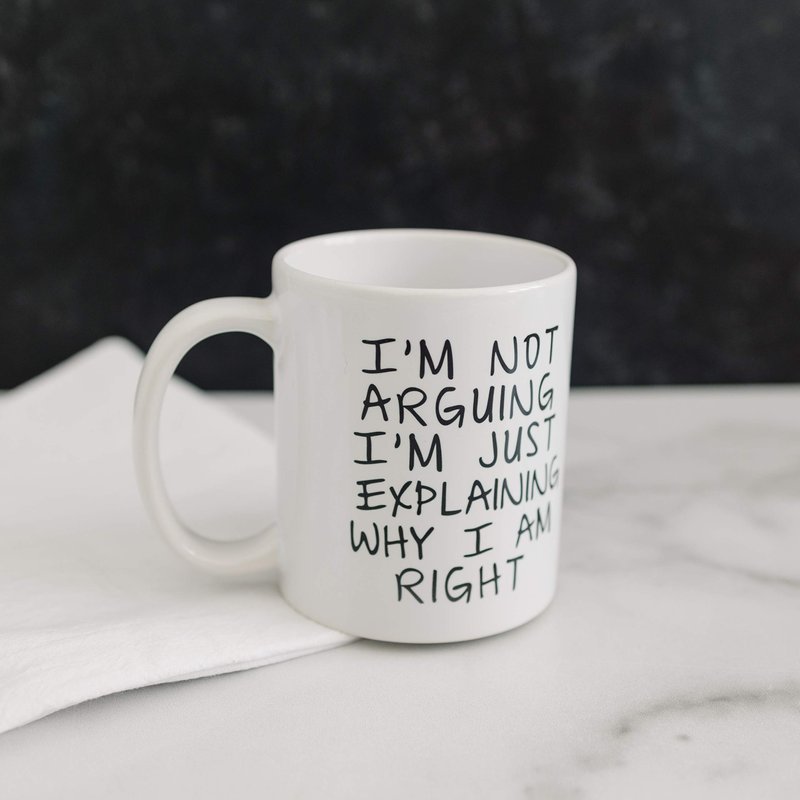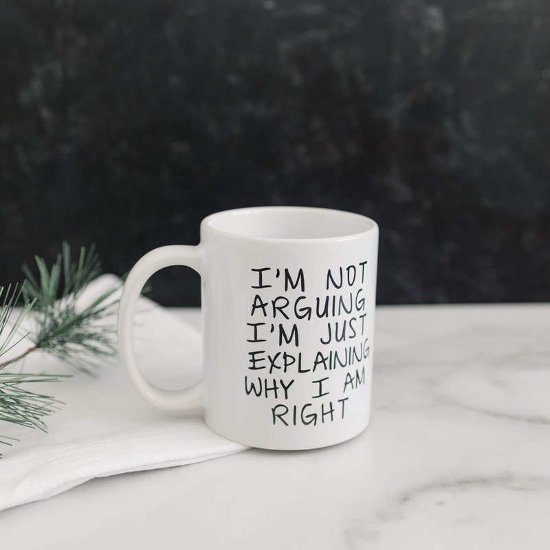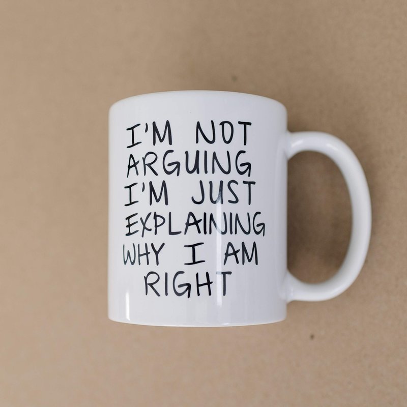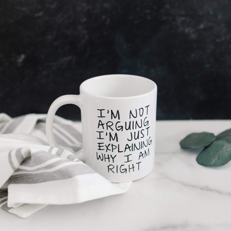 Coffee Mug says "I'm Not Arguing I'm Just Explaining Why I Am Right". Makes great gift for the opinionated coworker, friend or family member that claims to know it all