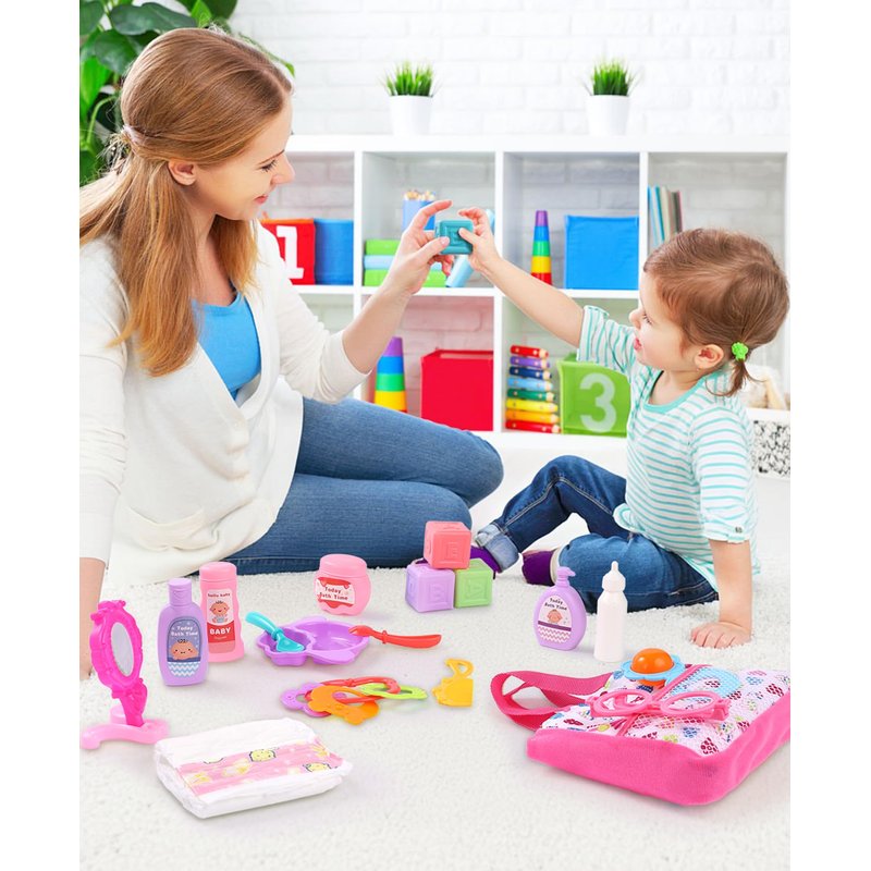 - Baby Doll Accessories:Comes with 23pcs doll accessories that can be packed up in storage bag,. Ideal for hours of pretend play.Every time the child has played, you can stuff everything into the bag.
