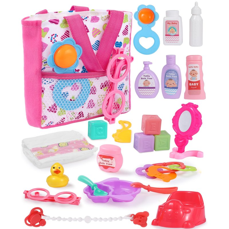 GAGAKU 23 Pack Baby Doll Accessories Set Baby Doll Feeding and Caring Set Includes Diaper Bag,Doll Diapers,Toys, Bottles,Pretend Play Set,Shower,Eating,and More, Perfect for Kids Toddlers and Girls