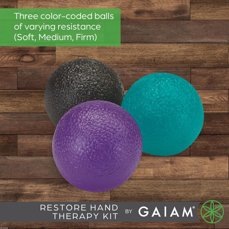 - Massage Therapy Balls - The Gaiam Restore hand therapy exercise ball kit includes three color-coded balls of varying resistance that help to improve flexibility, reduce stiffness, and relieve pain in the fingers and hands from carpal tunnel and arthritis.