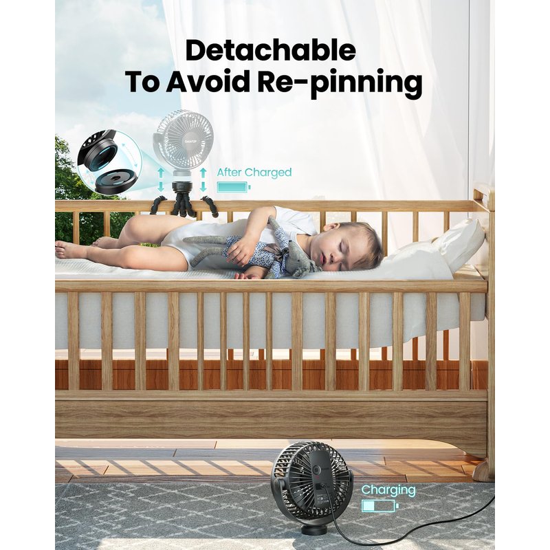 - Upgraded Flexible Durable Tripod: Shell made of food-grade silicone, safe for the baby; Optimized the tripod fixing method, which is more durable and not easy to fall off; You can remove the fan head to charge at will, no need to repeated fixation