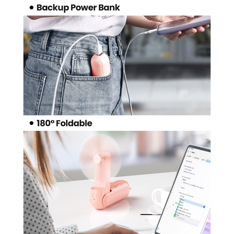 - Foldable Handheld and Desk Fan: The mini portable fan is super compact, lightweight and portable. Folding size: 4.47*1.41*1.45in, Weigh: 4.2 oz. It's a handheld fan when it is unfolded 180°, and a desktop fan when it is unfolded 90 or 270°. Pocket size is perfect for indoor and outdoor use. It will be a travel essential for any trips you have.