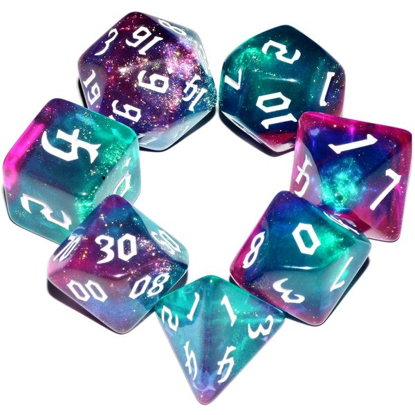 Specification: Quantity: 7Pieces (1-D4 1-D6 1-D8 1-D10 1-D10 (00-90) 1-D12 1-D20 Material: Resin Color: Glitter Green and Purple
