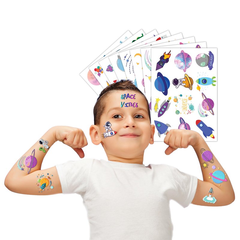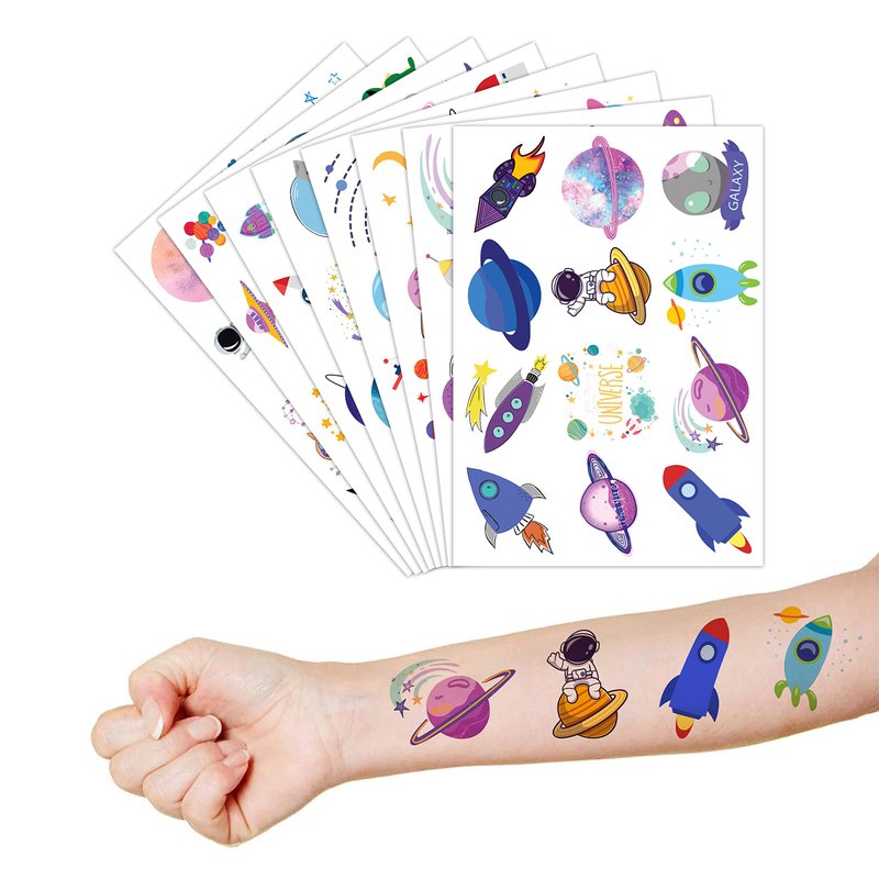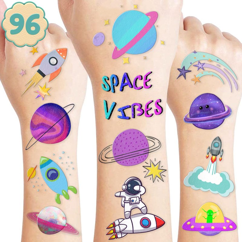 🌌🚀【PERFECT TATTOOS FOR THEMED SPACE, GALAXY DECORATIONS】:Galaxy, Space temporary tattoo stickers include 8 sheets in total. There are 96Pcs super cute tattoo differences. Perfect for giving out party favors and holiday theme small gifts. The size of each sheet is 6.1 * 3.1 inches. One size fits kids. 🎁【GREAT GIFT IDEAS FOR SPACE GALAXY PARTY SUPPLIES DECORATIONS】: You will receive many compliments when you decorate your child's birthday party with a Space theme. Space tattoos are a small gift you should not pass up for your kids. 🥳【Add a touch of fun】: Are you tired of mundane gifts? We've got you covered! Our collection of adorable and vibrant temporary tattoo designs can be applied to laptops, backpacks, desks, suitcases, books, water cups, and more. These playful elements will surely elevate your visual experience and bring a touch of joy to everyday items. 🌍【SAFE AND ENVIRONMENTALLY CONSCIOUS】: Our temporary tattoos are made from materials that are safe and prioritize sustainability. These tattoos are created using paper that is both safe for users and friendly to the environment. 🚀 A few notes about our GALAXY TATTOOS: 8 sheets + 96 tattoos means there's one for everyone - nobody gets left behind :D .Each of our temporary tattoos has a unique design with Galaxy, space,astronaut, spaceship, satellite, planet, universe, solar system, star, earth, perfect star, saturn, venus, jupiter, UPO, gifts for boy and girl Discover the universe …. Can be used for the galaxy birthday party, bridal shower + Christmas, Halloween, galaxy school supplies, baby shower! 【 Not recommended for people with a history of sensitive skin, if symptoms appear, stop using immediately】.