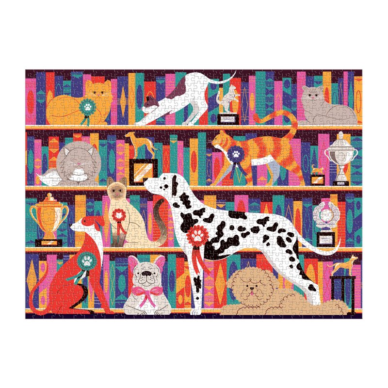 - 1000 PIECE PUZZLE – Best In Show 1000 Piece Puzzle by Galison is a witty shelfie of best in show felines and canines sharing shelf space with trophies and books. This puzzle is just the right level of challenge for the whole family to join in on for hours of puzzling fun! The box includes an insert with the full puzzle image for reference.