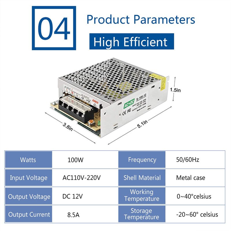 - 【Widely Uses】12V 8.5A 100W ac-dc power supply housed in a compact metal case. This rugged unit is ideal for reducing standby power usage in an abundant number of applications, more than a linear supply, such as industrial automation, 3D Print, DIY project works, LED display, LED strip light, etc.