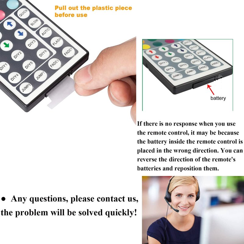 - 【KINDLY REMINDER】① Pull out the plastic cover on the buttom of remote before use. ② Connect box output port with led strip (arrows marks between control box and strip connector should be on same position). ③ Remote should be aimed at the ir receiver and without any obstacles.④ Indoor use only, keep away from water.