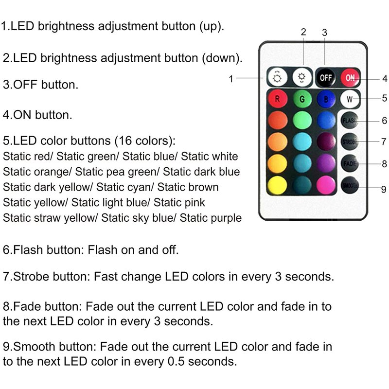 - 【24 KEY IR REMOTE CONTROLLER】 16 Static Colors with brightness increase and decrease. 4 Light Patterns: Flash | Strobe | Fade-change | RGB smooth-change. Turn On / Off or Adjust as you like.