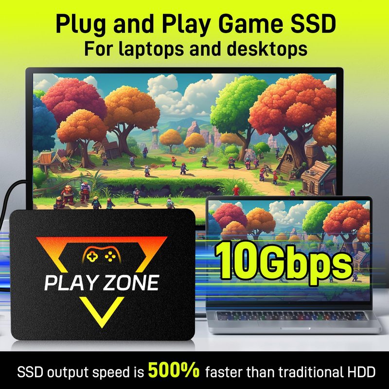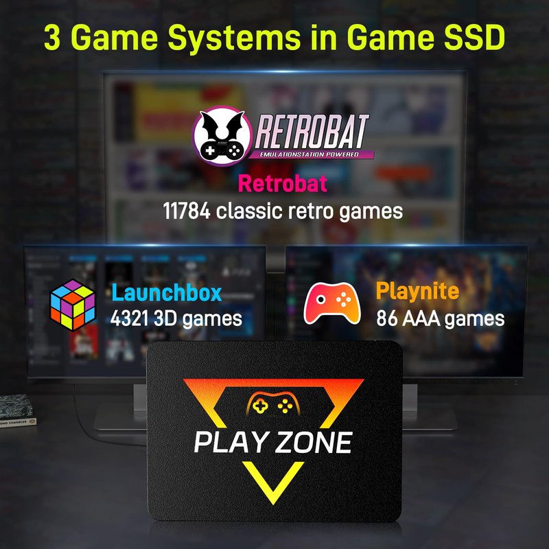 Why choose playzone's game hard drive? 1. Rich games and emulators, game console hdd is pre-installed with 16191 games, compatible with 80+ game emulators, rich game types, supporting classic retro games, arcade games, 3D games, PC games, large AAA games, etc. 2. Game console has 3 game systems, Retrobat mainly runs classic retro games, a large number of games from the 80s and 90s take you back to your childhood, Launchbox mainly simulates some popular emulators, mainly runs some popular 3D games, Playnite mainly runs some modern large AAA games, if you need a game list, please contact the seller. 3. Plug and play, simple operation, suitable for computers and laptops, support 64-bit win8.1 and above systems. 4. Brand original SSD, transmission speed 10Gbps, faster than HDD transmission speed, game runs more smoothly. 5. Support 26 system languages, you can switch to your common language. 6. Size 2.7 x 0.23 x 3.89 inches, smaller and more portable, convenient to carry when traveling on business trips. 7. Support multiplayer games, you can play with your family and friends.