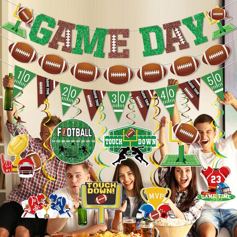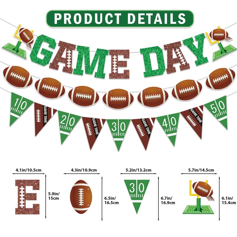 - Football Party Supplies Included: 1*Game Day banner ,1*pennant banner,1*football themed garland banner, 8* football hanging swirl,and 8*football elements hanging decorations.
