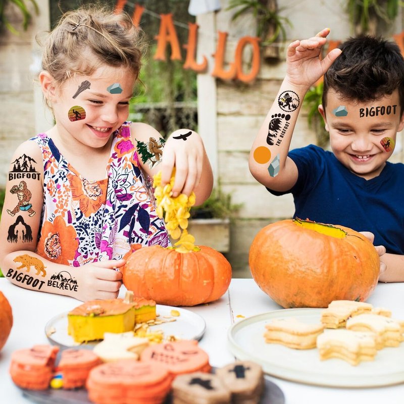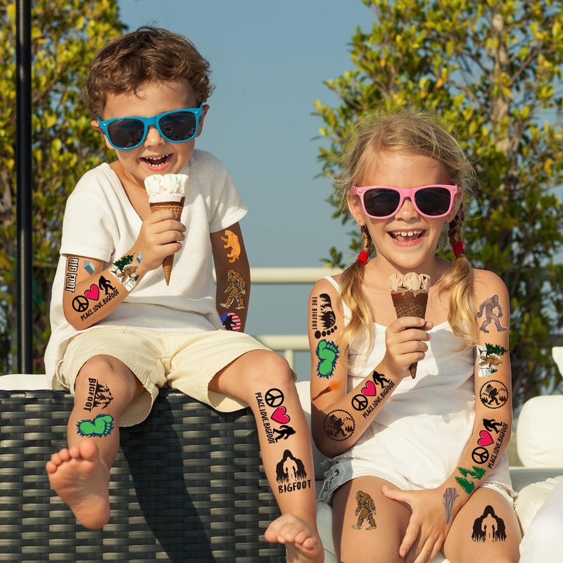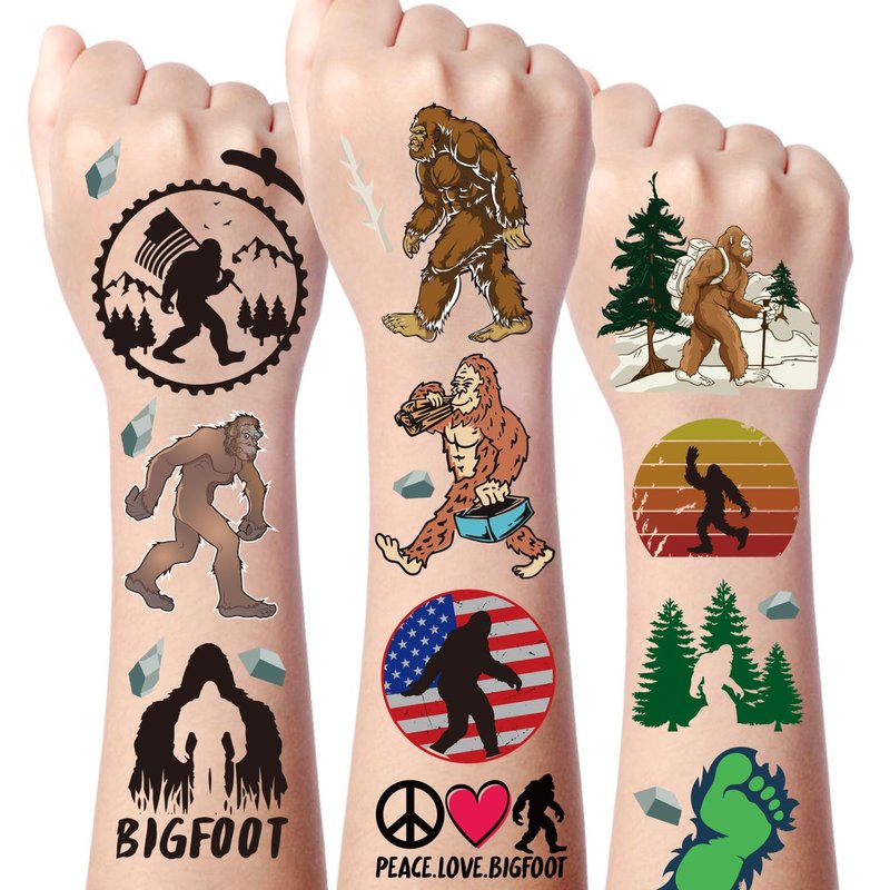 - Bigfoot Temporary Tattoos: Each tattoo sticker measures 9 inches x 6.3 inches, 8 sheets in total, each tattoo sticker has over 20 different Bigfoot-themed tattoo designs, so you can get over 160 small tattoos, enough for your whole party!