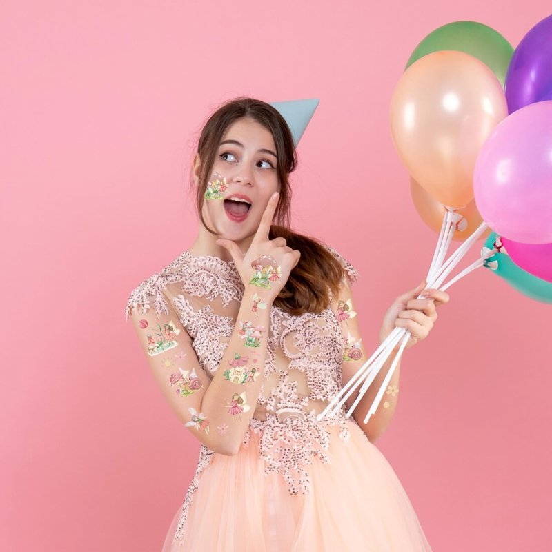 - Fairy Tattoo Set: Each tattoo sticker measures 9 inches x 6.3 inches, 8 in total, with over 28 different pink tattoo designs per tattoo sticker, so you can get over 224 small tattoos, enough for the whole party!