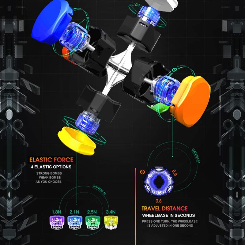 - [Tuning System] GAN 356 M has the latest GAN tuning system, GES+, with 4 bullet strengths and 2 travel distances for you to choose from, which can be adjusted by simply pressing and twisting, easily removing the bullet and replacing it with another in just a few seconds.The greater the distance, the weaker the elasticity, and the looser the cube. Otherwise, it will become tighter.