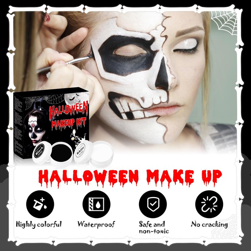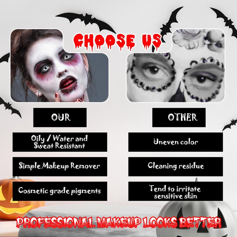 Ganbaro Halloween face painting is light and smooth,with rich colors that are perfect for creating a variety of Halloween makeup looks. Long-lasting black,white and red face painting oil paints,high chroma,waterproof,strong lasting power,can keep the painting effect all day long.Safe and harmless How to use 1.Mix the paint with the protective oil layer before use 2. Apply with a foundation brush and face sponge in a patting motion and smooth out to desired coverage. 3. Avoid pulling or stretching the skin. Gently apply around the eye area where the skin is very thin and delicate. How to remove Remove with professional makeup remover oil/ olive oil. Note: Please make a small scale skin patch test before application, If appear redness, swelling, itching and so on, please stop immediately Avoid contact with eyes directly when use face paint. In case of eye contact,please rinse with clean water immediately and ask doctor for help Keep in a cool and dry place, away from direct sunlight and high temperature. Do not eat.