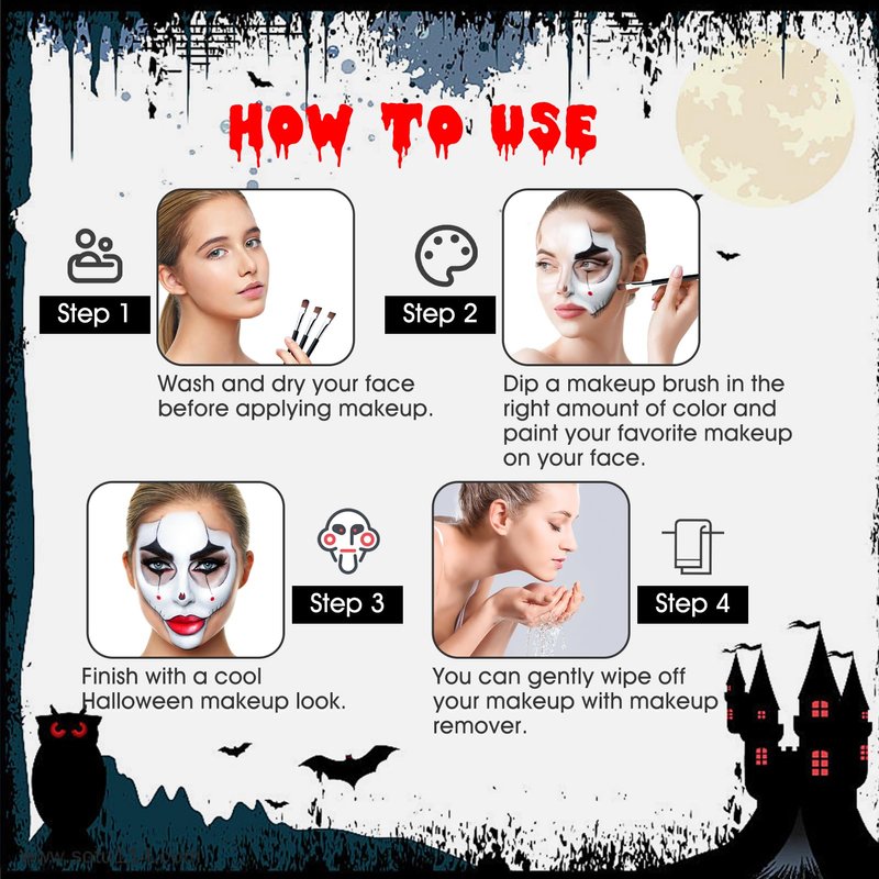 - HOW TO USE: White pigment has a layer of oil on the top layer is to prevent the pigment from melting, you need to stir it away before painting.Determine the makeup look you want, then use the provided brush or sponge to take out the corresponding color of paint to apply makeup and add sparkle to holiday celebrations