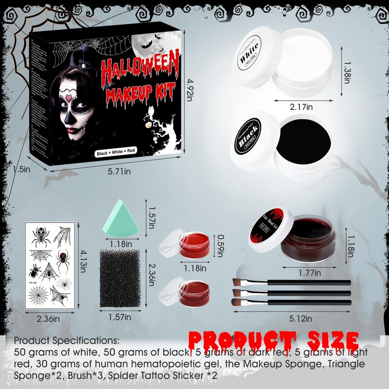 - HALLOWEEN PAINTING: The face painting contains 30ml liquid red blood gel + 50g black + 50g white + 5g dark red + 5g light red + 2 pieces body paint sponges + 3 makeup brushes+ Body Halloween sticker for face and body painting
