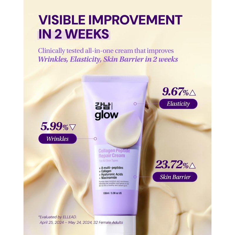- [ALL IN ONE SOLUTION] Achieve healthy, youthful complexion with Gangnam Glow Collagen Peptide Repair Cream. From Improving skin elasticity and smoothing the fine lines to strengthening skin barrier, this cream provides all-in-one benefits at once!