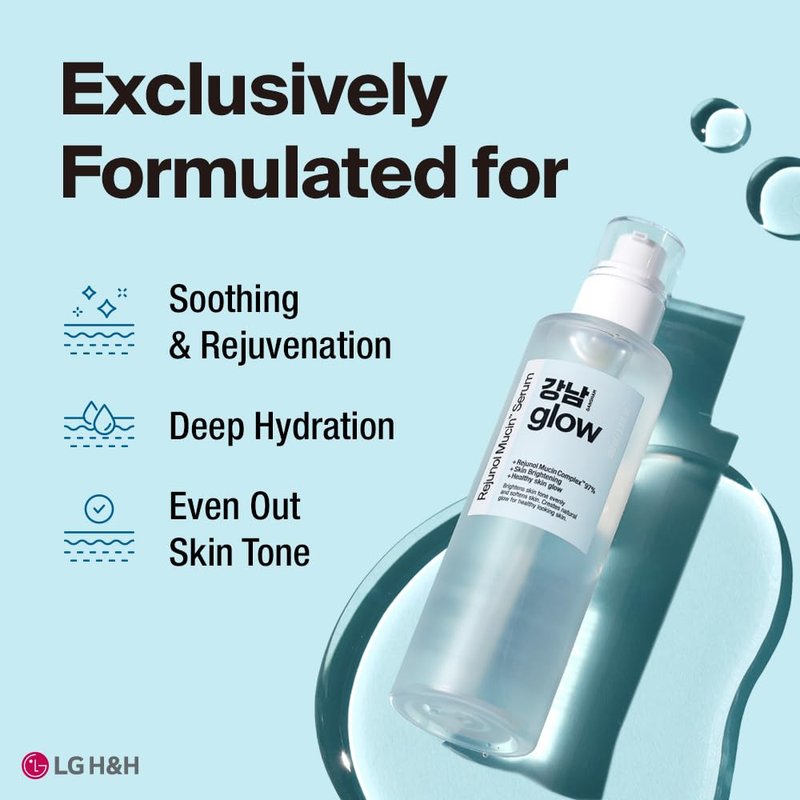 - 🌱With GANGNAM GLOW, Without Any Concerns : GANGNAM GLOW Rejunol Mucin Serum is formulated with skin-friendly ingredients that soothe irritated skin. Hypoallergenic Tested, Formulated without Silicone Oil, Tar Color, Synthetic Fragrance, Talc, Mineral Oil, Paraffin Wax, and Petrolatum