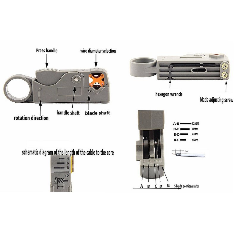 - Fully Adjustable and Replaceable Blades can Strip Cable Perfectly: Work with rg59, rg59 quad, rg6, rg6 quad, and rg58, 3V, 2V, 4C, 5C. Equipped with hexagonal tools can adjust the depth of the v-shaped incision, 3 to 7 clockwise circle, one-time peeling, keep inner core.