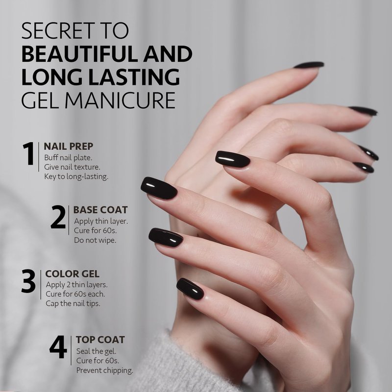 - 4 weeks long-lasting: Buff your nail bed before base coat to give your nail texture. Apply top coat after color gel for shiny finish.